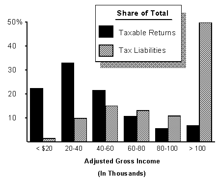 The top 7 percent of taxpayers -- those with incomes exceeding $100,000 annually -- will account for nearly 50 percent of total tax liabilities in 1996. This share is slightly lower than in 1995, primarily because of the scheduled elimination of the 10 percent and 11 percent tax brackets.