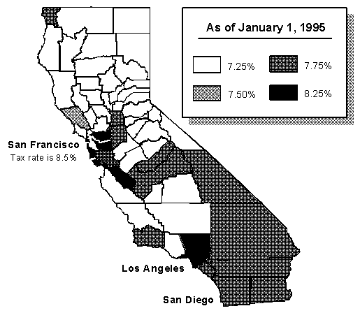 Existing sales tax rates range from 7.25 percent in counties with no optional sales and use taxes, to 8.5 percent in the City and County of San Francisco.