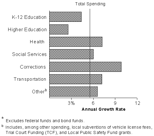 Total state spending has grown at an average annual rate of 5.7 percent over the last decade, but annual spending growth for major program areas during this period varied from a low of 2.6 percent for higher education to a high of 9.9 percent for corrections.