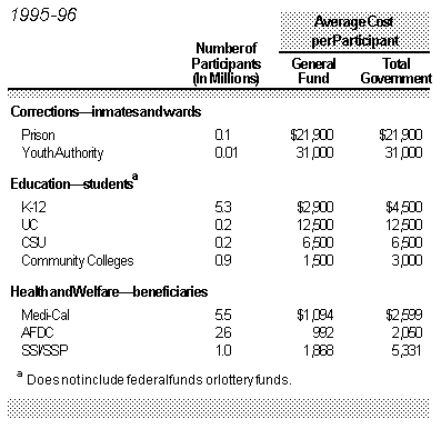 Youth Authority wards and prison inmates have the highest cost, but are the least numerous. For example, the cost to maintain a ward is about $31,000, while spending per K-12 student in the public schools is about $4,500. However, prison inmates and Youth Authority wards number less than 160,000, while there are 5.3 million K-12 students.