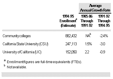 From 1991-92 through 1994-95, higher education enrollments declined on average each year by 3 percent for CSU, 2.4 percent for the community colleges, and 0.9 percent for UC. The total decline of 94,000 students is the equivalent of about five large campuses.