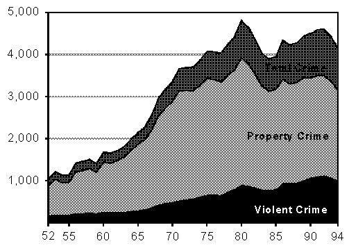 California's incarceration rate has increased almost 350 percent since 1972 while the crime rate has remained relatively flat (the rate in 1994 is essentially the same as 1972).