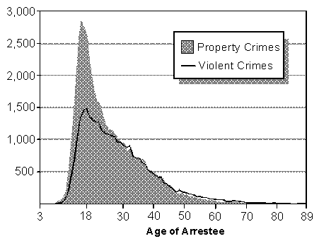 The felony arrest rate peaks at age 16 for property crime and age 18 for violent crime.