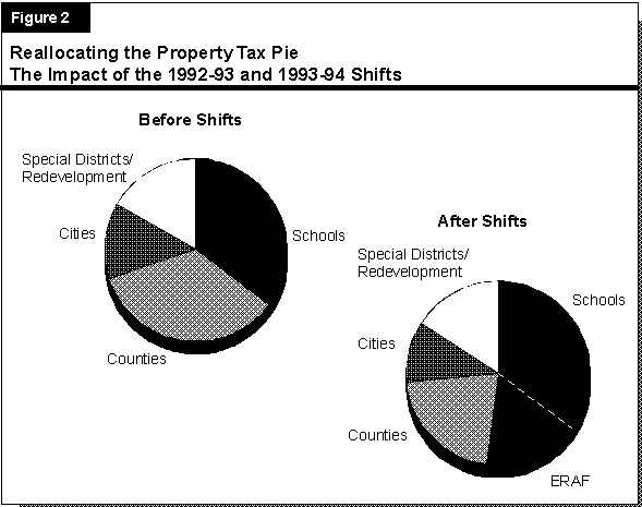 Reducing State Costs. In order to reduce state GF costs for schools in 1992-93 and 1993-94, the Legislature and administration changed the laws regarding the allocation of property taxes. Specifically, the state required auditors to deposit some of the property taxes that previously had been allocated to nonschool local agencies into a newly created county-wide fund for schools, the "Educational Revenue Augmentation Fund" (ERAF). Property taxes from the ERAF are distributed to schools thereby offsetting the need for state school aid. As shown in Figure 2, the property tax shift shrank the nonschool local agency share of the property tax "pie" and expanded the school share. The overall level of school funding was not affected.