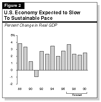 Inflation to Remain Low. Figure 1 also shows that we forecast that inflation will remain low. After dipping to just 2.3 percent in 1998, the U.S. CPI is projected to rise slowly to 3.1 percent by the year 2000. This outlook assumes some acceleration in wages, but it also assumes that strong foreign competition will limit the ability of domestic businesses to significantly raise product prices over the next several years.