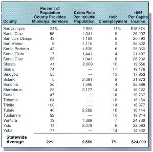 As we discussed earlier in this report, counties' municipal and other program responsibilities differ markedly. In reviewing Figure 8, therefore, we suggest that readers compare only those counties known to have similar responsibilities because differences in program responsibilities may fully offset apparent revenue differences. For example, Figure 8 shows that Sacramento County receives higher general purpose revenues than San Mateo County. Because Sacramento County has many more people living in its unincorporated areas, and has a higher poverty and crime rate, Sacramento probably has less revenue flexibility than San Mateo. For similar reasons, Kern County probably has less revenue flexibility than Santa Clara County. Finally, as discussed earlier, because of the size of their seasonal and daytime populations, we suggest reviewing data for very sparsely populated resort-oriented counties and San Francisco separately than other counties.