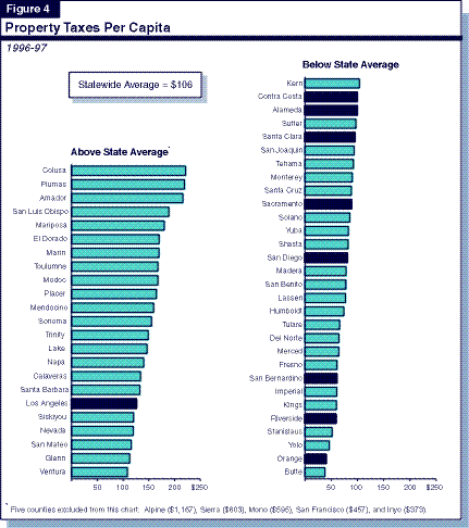 First, taxation decisions of a generation ago continue to be a dominant influence on the level of county revenues today. For example, differences in their 1970's property tax shares appear to be the most important factor explaining the differences in revenues for Los Angeles, Orange, and San Diego Counties, and for Butte and adjacent Colusa Counties.