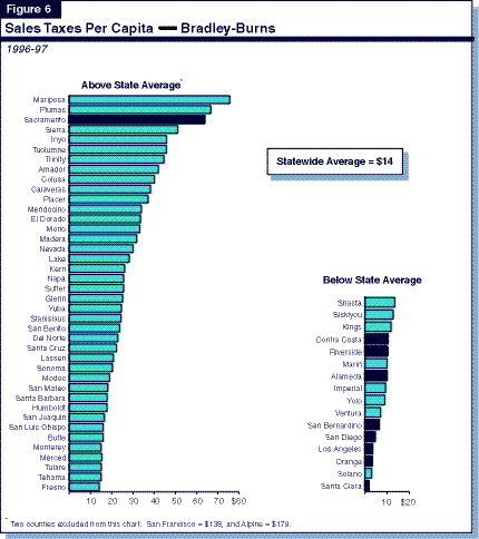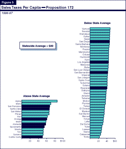 Figures 5 and 6, respectively, display each county's per capita revenues from the Proposition 172 and Bradley-Burns sales taxes. As we discuss below, the relative county ranking under these two sales taxes is often very different.
