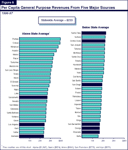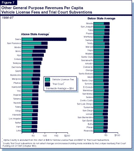 Figure 7 shows each county's revenues from vehicle license fees and trial court subventions. Compared with the counties' three major sources of general purpose revenues, there is much less variation in per capita county revenues from these sources.