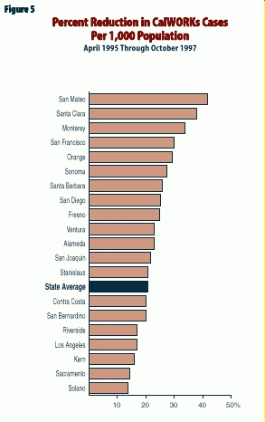 Federal and state welfare reforms have focused increasing attention on moving families from welfare to self-sufficiency. To measure the effectiveness of county efforts to promote this goal, ideally information would be available on the "work readiness" (education and employment history) of each family on the CalWORKs program, and each family's change in income after leaving the program. Because such data do not exist, Figure 5 provides a "second-best" measurement of county success. Specifically, Figure 5 shows for the 20 largest counties, the decline in welfare dependency rates between April 1995 (the statewide peak in CalWORKs caseload) and October 1997. During this period, CalWORKs cases dropped by 20 percent statewide, but there was variation among counties.