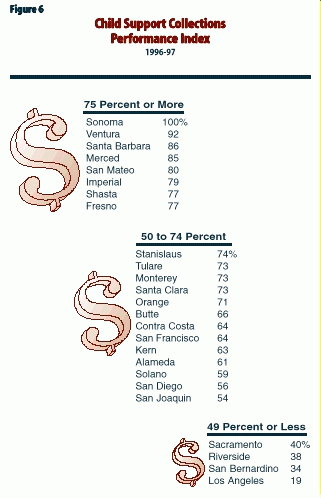 Figure 6 compares the 25 largest counties on an index of their performance in child support collection in 1996-97. The index measures each county's collections per case on behalf of families receiving CalWORKs, relative to the collections of the best performing county. For example, the county with the highest collections (Sonoma) receives a score of 100 percent, and a county with a score of 75 percent would indicate that the county had 75 percent of the collections of the best performing county. Figure 6 indicates that there was a wide range in county performance. Four counties (Sacramento, Riverside, San Bernardino, and Los Angeles) had less than half the rate of collections of the highest performing county (Sonoma). While the findings in Figure 6 pertain to CalWORKs cases, our review suggests that county success in collecting child support for nonwelfare families is likely to be similar.