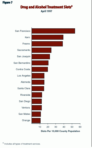 Figure 7 shows the number of treatment slots per 10,000 population for the 15 largest counties in April 1997. A variety of factors affect the number of treatment slots, including the amount of state and federal funds allocated to a county for drug treatment, the amount of county funds allocated for drug treatment, the availability of services, the level of demand for certain types of treatment, and the willingness of providers to create new treatment programs in a county or geographic area. We note that some of these factors are beyond the control of county drug and alcohol programs. Furthermore, while the number of treatment slots does not measure program performance, it is an important "input" variable that may be related to program outcomes.