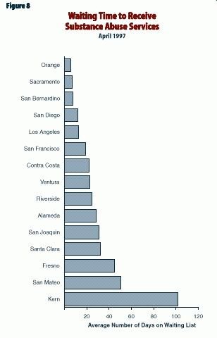 During April 1997, 3,800 people statewide moved into treatment programs after waiting an average of 20 days for services. As Figure 8 shows, wait times ranged from 102 days in Kern County to less than 6 days in Orange County. It is important to note that the length of waiting lists varies by treatment types. People who moved into a residential detoxification program waited an average of four days for services. In contrast, the wait for a narcotic treatment program slot was much longer, which in some counties contributed to a longer overall wait time for services. Kern County, for example, moved 7 people (who waited an average of nearly two years) into the narcotic treatment program, and 72 people (who waited an average of 42 days) into other types of treatments.