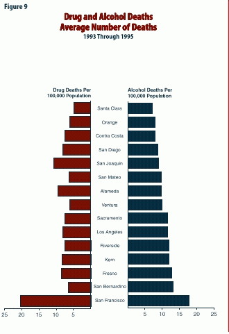 Because of the detrimental effects of drug and alcohol addictions on people's health, capacity to earn a living, and ability to maintain shelter, some people die from untreated drug and alcohol addictions. Figure 9 illustrates an outcome measure for county drug and alcohol programs: the average annual number of drug- and alcohol-related deaths per 100,000 population from 1993 through 1995.