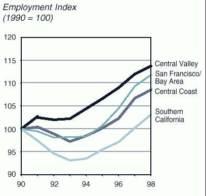 Economic performance in the 1990s has varied markedly among California’s major geographic regions.