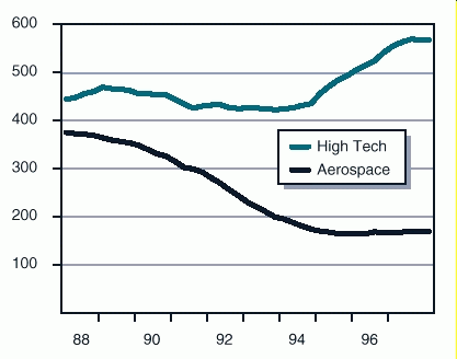 These two developments explain much of the divergent economic trends between Northern and Southern California in the 1990s. The majority of the state’s high-tech industries are located in the Bay Area, while the majority of the aerospace industry jobs that were lost were in Southern California.