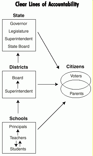For accountability to work, it is important to establish who is accountable to whom. An effective system should have clear lines of accountability that reach all levels of decision making. The figure on the next page displays a basic, yet fairly comprehensive scheme of accountability relationships. The state is the ultimate trustee of public education under the state Constitution. The key state playersthe Governor, Legislature and Superintendent of Public Instructionare accountable to the voters for this public trust role. School districts, as the main point of contact between the state and schools, are accountable to the state. Like the state, districts also are accountable to the voters and parents, through locally elected boards.