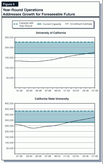 If the state implemented year-round operation, it would have the effect of increasing the "capacity" of the higher education segments by up to one-third. Figure�5 illustrates the additional capacity year-round operation would provide at UC and CSU. As shown in Figure�5 (see page 8), a total of over 150,000 FTE additional students could be accommodated within existing facilities at UC and CSU by adoption of year-round operation. This is significantly higher than the 113,000 FTE student enrollment increase projected by 2007-08. Thus, under a full program of year-round instruction, both UC and CSU would have ample capacity well beyond 2007-08.