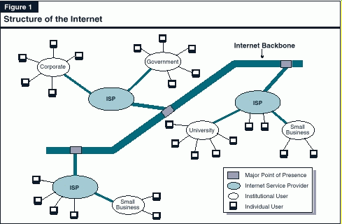 The basic "layout" of the Internet is shown in Figure�1 (see page 4). It consists of (1)�individual users who connect to ISPs, most often through dial-up telephone lines or cable; and (2)�institutional userssuch as universities, governments, and large commercial entitieswhich generally connect to ISPs using dedicated wiring such as LANs or leased telephone lines. The ISPs are then linked to a regional or mid-level network which, together with other regional networks, connect to a "major point of presence" (MPOP). These MPOPs are linked at very high speeds to create the Internet backbone. The U.S. Internet backbone connects to other backbones around the world. Links to web sites, e-mail to individuals, sales transactions, and other uses of the Internet go through these networks and commercial service providers.