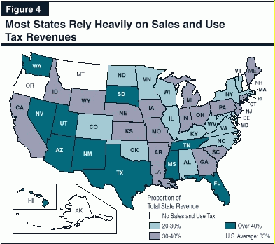 The growth of Internet activity, coupled with substantial reliance on SUT revenues by state and local governments, poses a legitimate cause for concern on the part of public officials in California and other states regarding revenue impacts. As shown in Figure�4, many states are reliant to a substantial degree on revenues from the SUT. In addition to this potential Internet-related revenue loss, the distinction between remote sellers and traditional businesses identified above creates tax inequities. As a result of this tax differentiation, some businesses get an unfair competitive advantage over others, and some consumers get tax-related "price breaks" while others do not.