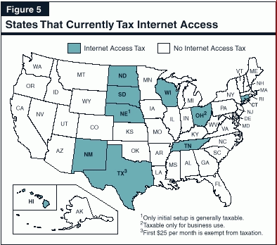 The concerns in this second area relate to the tax treatment of Internet communication activity itself, as opposed to treatment of sales using the Internet. In California, no Internet access tax currently is in place. However, such taxes have been proposed by some California localities in the past, and are levied in some form in a number of other states and localities (see Figure�5, next page). Some of the states shown in Figure�5 are considering repealing these access taxes.