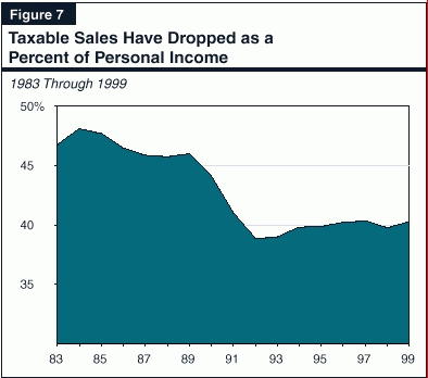 Recently, SUT collections have displayed strong performance. Taxable sales, for example, grew by over 8�percent in 1999 reflecting the state's extremely robust economic performance and booming expenditures for both consumer durables and business investments. However, SUT performance often did not keep pace with the economy during the 1980s, as evidenced by the past declines in the ratio of taxable sales to personal income and the failure of this ratio to materially rebound during economic expansions (see Figure�7, page 12).