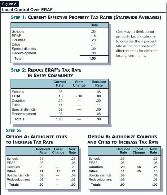 After reducing the property tax rate from 1�percent of assessed value to 0.9�percent, the Legislature would instruct cities and/or counties that it is their decision whether to (1) increase city or county property taxes up to the maximum 1 percent rate and/or (2) pass on the tax cut as property tax relief to property owners in their communities. Figure�2 (see page 14) provides examples of this alternative. As the figure shows, the first step in the alternative is to view the 1�percent rate as the composite of different rates for different local governments. (The rates shown in the figure represent statewide averages.) The second step is for the state to reduce ERAF's share of the property tax. Finally, in the third step, the Legislature gives cities (or cities and counties) authority to increase the rate. While our example shows local governments increasing the rate to the maximum, some local governments would choose not to increase the tax rate, and pass on the tax cut to their residents.
