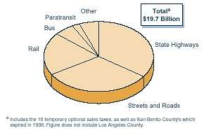These counties have chosen to spend their revenues on a combination of highways, local streets and roads, and mass transit. Excluding Los Angeles County, for which data are not available, total revenues are projected to be spent as follows: