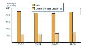 Rail transportation constituted about 18 percent of total mass transportation ridership during 1997-98. The bulk of rail travel was on commuter and urban (light) rail systems.