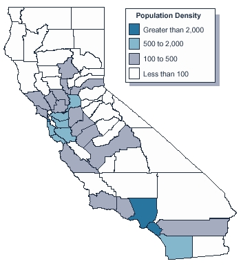 California is more densely populated than the United States as a whole--220 versus 78 persons per square mile. Density varies widely by