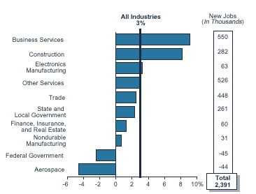 Lagging industry categories have included aerospace and federal government employment, both of which have been adversely affected by defense cutbacks.