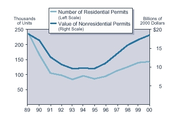 The rebound in the residential sector has been moderate by historical standards, with permits currently well below the 1980s' average. This reflects such