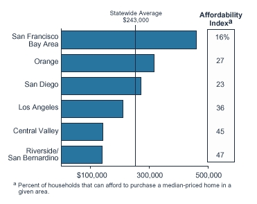 By far, the highest cost region is the San Francisco Bay Area, which had a median home price of $460,000 in mid-2000. At the other extreme, the median