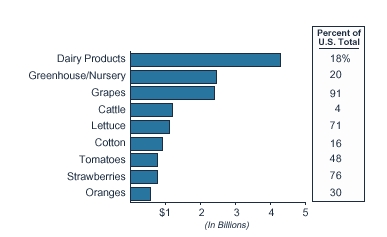 Major commodities in California include dairy and nursery products, grapes, cattle, and lettuce.