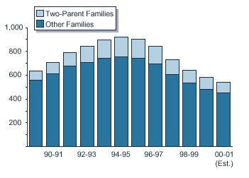 - After peaking in 1994-95, the caseload declined 37 percent by 1999-00 and is projected to decline an additional 7 percent in 2000-01.