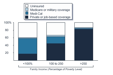 - Almost 90 percent of nonelderly Californians with incomes above 250 percent of poverty have health insurance coverage.
