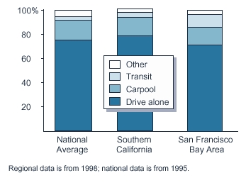 - In Southern California, 78 percent of commuters drove alone to work in 1998, while in the San Francisco Bay Area 71 percent of commuters drove alone to