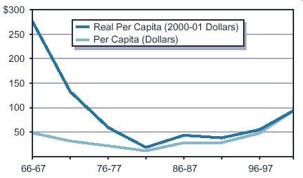 - Per capita spending has increased moderately, but steadily, since the early 1980s, with the increase in 2000-01 spending due largely to added funds for