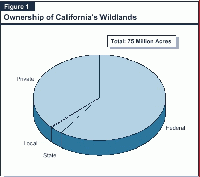 As shown in Figure�1, ownership of California's 75�million acres of wildlands is divided primarily among federal, state, and private entities. The federal government owns 60�percent of California's wildlands, and 37�percent is privately owned. Almost all the rest (about 2.3�million acres in actual property and easements, or slightly more than 3�percent) is owned by the state, primarily under the control of the Departments of Fish and Game (DFG), Parks and Recreation, and Forestry and Fire Protection. Less than one-half of 1 percent is owned by local governments.