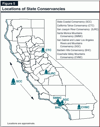 Figure�6 lists state conservancies that are associated with state regulatory agencies. For example, the CCC enforces the Coastal Act of 1976 by regulating development activity in the coastal zone. The SCC complements the regulatory process by providing an opportunity for private landowners to sell property that the state would otherwise regulate for conservation purposes. By acquiring property, SCC also achieves a more permanent advancement of the Coastal Act's goals. Similarly, the Tahoe Conservancy complements the regulatory activity of the Tahoe Regional Planning Agency.