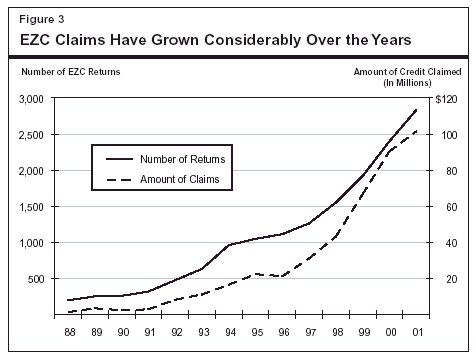 In terms of its direct revenue impact on the state, the EZC has a relatively minor effect, although its impact has grown considerably over time. Figure 3 indicates the estimated value and number of EZCs used to offset CT and PIT tax liabilities over the 13 years available. In the 2001 income year, such credits amounted to slightly over $100 million including nearly $70 million under the CT and somewhat over $30 million under the PIT. Much of the increase over the period shown is attributable to the growing number of EZ designations and, to a lesser extent, a somewhat more lenient interpretation of qualified employees. According to the Franchise Tax Board (FTB), which tracks credit usage, the average EZC awarded per claimant under the CT in recent years is about $60,000.