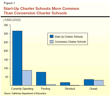 "Start-Up" Charter Schools More Common Than Conversion Charter Schools. In California, charter schools may be newly created as a start-up charter school or else a traditional public school may close and reopen as a "conversion" charter school. Figure 1 shows the number of start-up and conversion charter schools that are (1) currently operating, (2) pending, (3) have closed, or (4) have had their charter revoked. As the figure shows, about four out of every five currently operating charter schools are start-up schools whereas one out of every five is a conversion school.