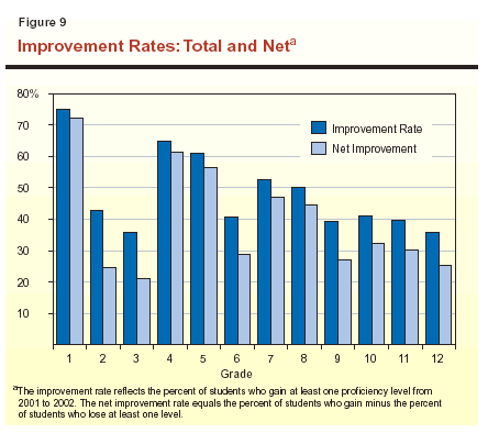 Technical Flaw in the CELDT. Improvement rates shown in Figure 9 for grades 2, 3, 6, and 9 are very different than in the other grades. In each of these grades, there is a large reduction in the proportion of students improving on the test and an increase in the percentage of students losing at least a level on the test. In Figure 8, we observed an increase in the number of second and third grade students scoring at the lower two levels on CELDT. The data in Figure 9 illustrate that smaller gains and larger losses of students in these grades are resulting in these unusual outcomes.