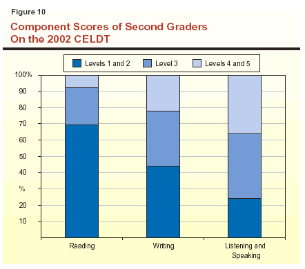 Reading and writing pose major challenges to EL students in the early grades. The CELDT tests students in reading and writing for the first time in second grade. In general, students fare poorly on this test and on the third grade test, when the demands of the CELDT in reading and writing increase significantly. These early-grade results seem to reflect longer-term problems that slow student progress in mastering English.
