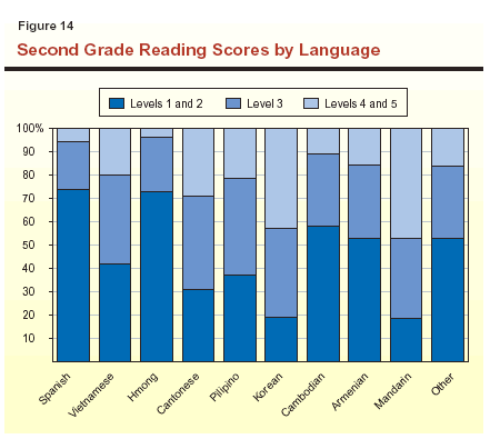 Figure 2 shows the native language of EL students taking the CELDT test. Spanish speakers dominate the EL population in California, accounting for 83 percent of EL students. Asian and Pacific Islander languages account for seven of the next eight largest groups and represent 9 percent of the EL population. The "other" group, accounting for 6.8 percent of EL students, is composed of students speaking one of at least 50 other languages.