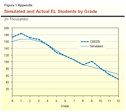 Figure 1 Appendix shows our final simulation result and the CBEDS count of EL students. The simulated estimate of EL students is the same as the "total EL cohort" discussed in the report (2001 kindergarten students plus new entrants).