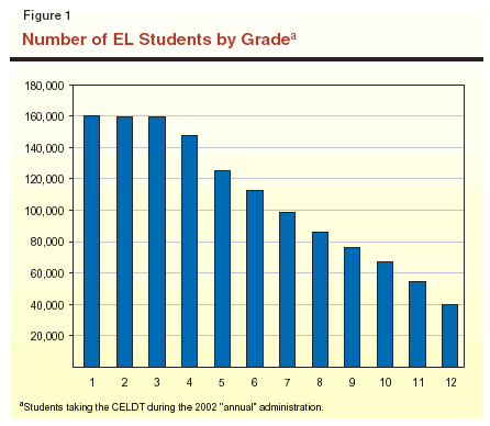 Figure 1 illustrates the number of EL students who took the 2002 CELDT test by grade. As the figure shows, there are about 160,000 EL students each in grades 1 through 3. Beginning in grade 4, the number of students begins to decline. By twelfth grade, there are 40,000 EL students attending California schools.