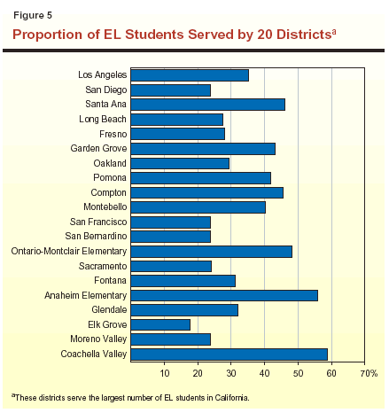 The proportion of EL students in these large districts varies significantly. In five districts, more than 45 percent of the districts' students are classified as ELs. Of these, more than half of the students at Anaheim Elementary and Coachella Valley are ELs. In contrast, about one-quarter of students in six districtsincluding San Diego and San Bernardinoare ELs and only about 18 percent of students in Elk Grove are classified as ELs.