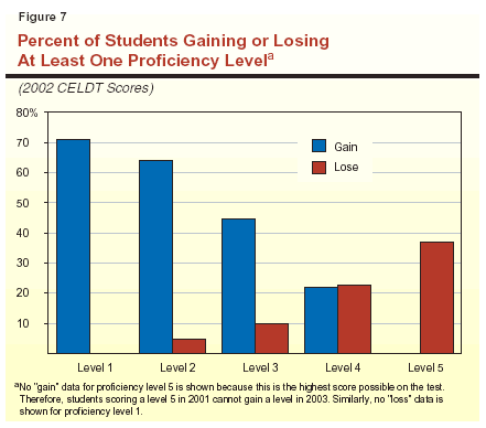 Figure 7 displays the percentage of students at each CELDT proficiency level in 2001 that gained or lost at least one level on the 2002 CELDT. In total, half of students improved at least one level on CELDT in 2002. The proportion of students gaining a proficiency level is highest for students at the earlier stages of learning English. More than 70 percent of EL students who scored a 1 in 2001 scored at least a 2 in 2002. Similarly, 64 percent of students scoring at level 2 in 2001 scored a 3 or higher in 2002.