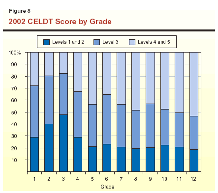 Figure 8 displays the 2002 CELDT scores by grade level. In first grade, the EL population is fairly evenly distributed, with just under 30 percent in both the lowest and highest two levels. The remaining 42 percent of students scored in level 3. The proportion of students scoring in levels 1 and 2 increases to almost 50 percent by third grade. Beginning in fourth grade, the proportion in levels 1 and 2 falls sharply and hovers around 20 percent from grade 5 through grade 12.